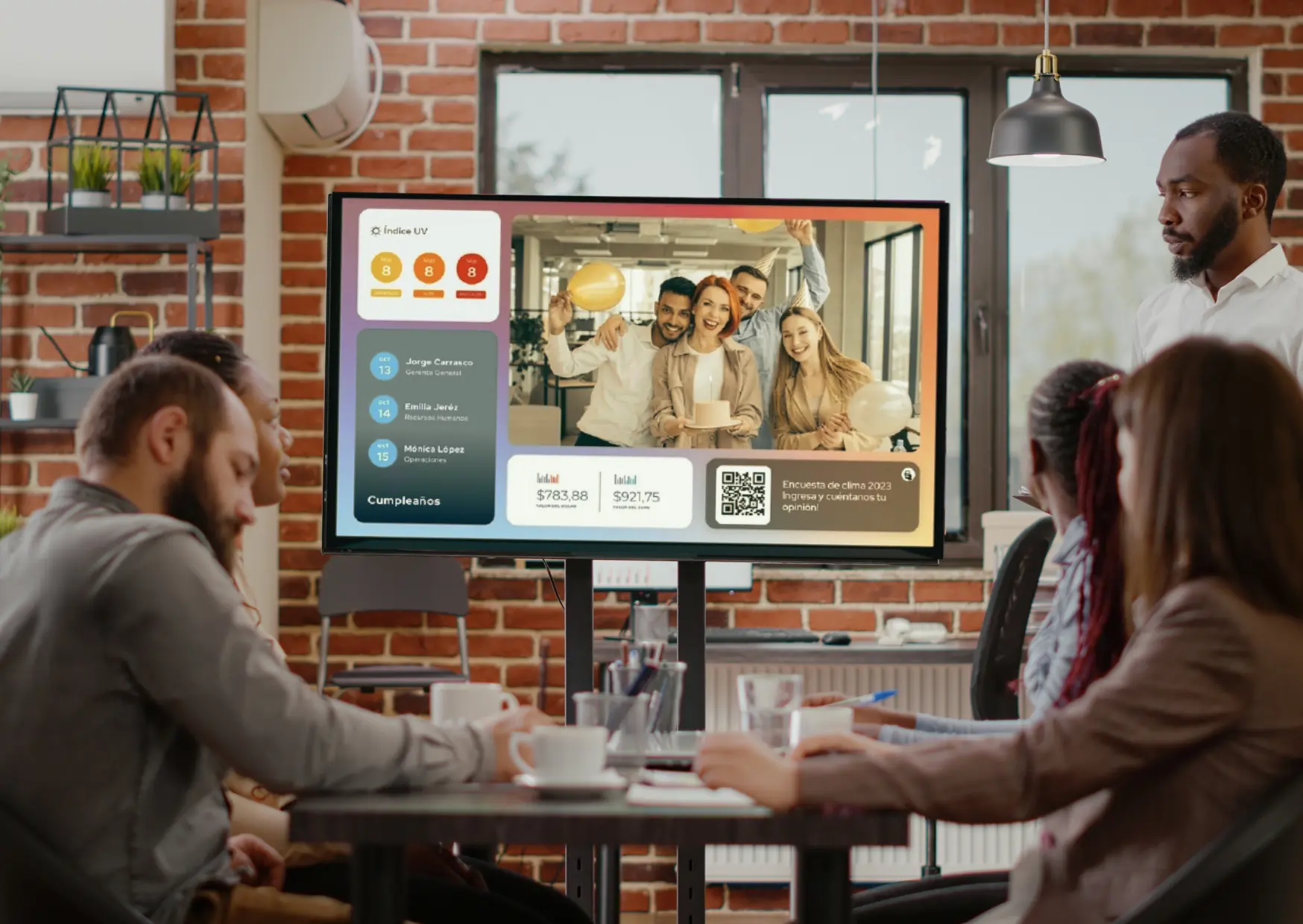 - Potencia la comunicación en tu empresa, a través de una red de pantallas con información actualizada y atractiva con contenido visual como videos, KPI's por área, reconocimientos e información de redes sociales.
