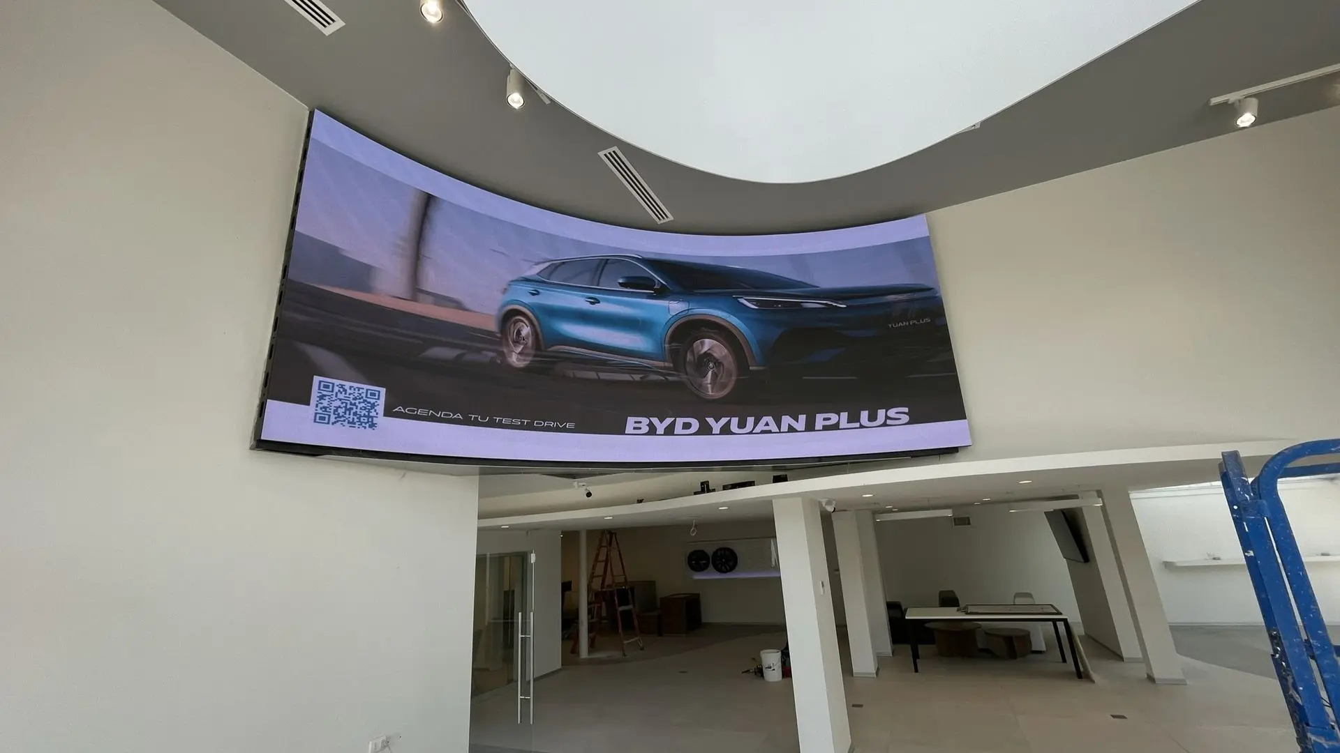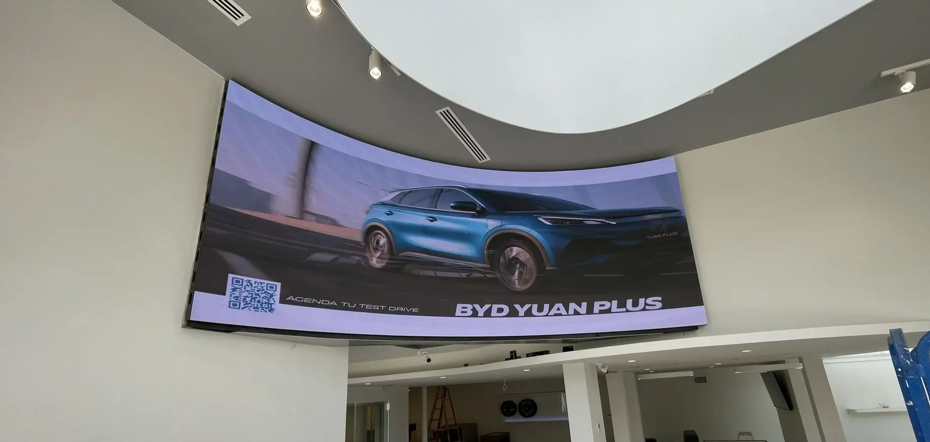 - Pantalla LED Curva Monumental: implementamos una pantalla LED curva de impresionantes dimensiones (5,12 x 2,1 metros) que crea una experiencia visual envolvente y cautivadora, reflejando la innovación de los diseños BYD.