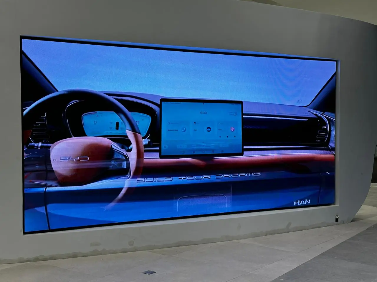 - Pantalla LED Curva Monumental: pantalla LED curva de impresionantes dimensiones (5,12 x 2,1 metros) que crea una experiencia visual envolvente y cautivadora, reflejando la innovación de los diseños BYD.