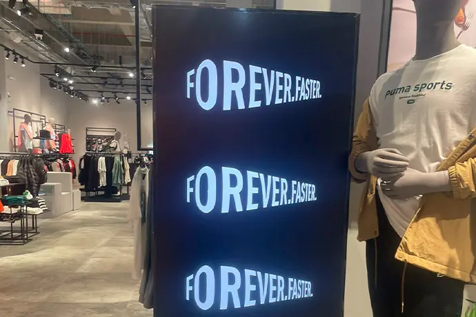- Fachada de Impacto Deportivo: implementamos una pantalla LED exterior que comunica la energía running y posiciona a Puma como referente deportivo en Puruchuco.