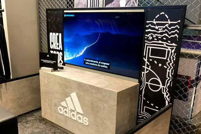 Para este proyecto, se han implementado monitores ultradelgados. Estos equipos representan lo último en tecnología de visualización, ofreciendo una calidad de imagen excepcional y una estética moderna que complementa perfectamente la identidad de marca de Adidas. La combinación de estos dispositivos ha permitido a Adidas crear experiencias visuales únicas y cautivadoras que conectan con su audiencia de manera más profunda y significativa.