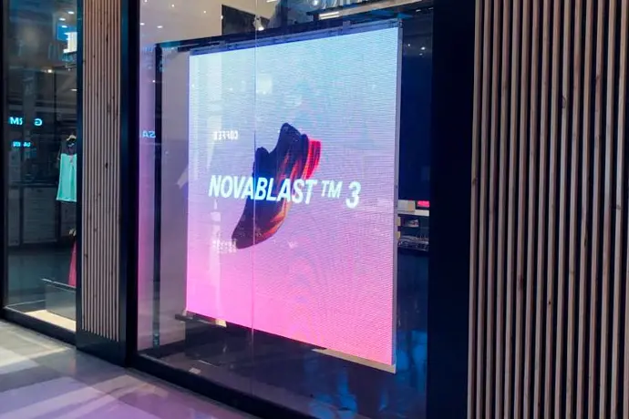 - Tecnología Transparente: implementamos pantallas transparentes que fusionan información con ambiente, creando un diálogo visual entre producto y aspiración sin interferir con la estética de ASICS.