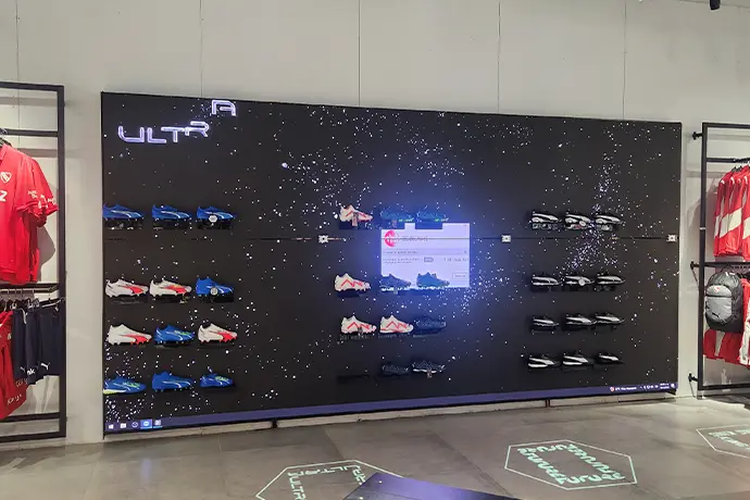 - Zona Ecommerce Integrada: desarrollamos un monitor táctil con mini PC que permite navegar el ecommerce Puma directamente en tienda, fusionando experiencias físicas y digitales.