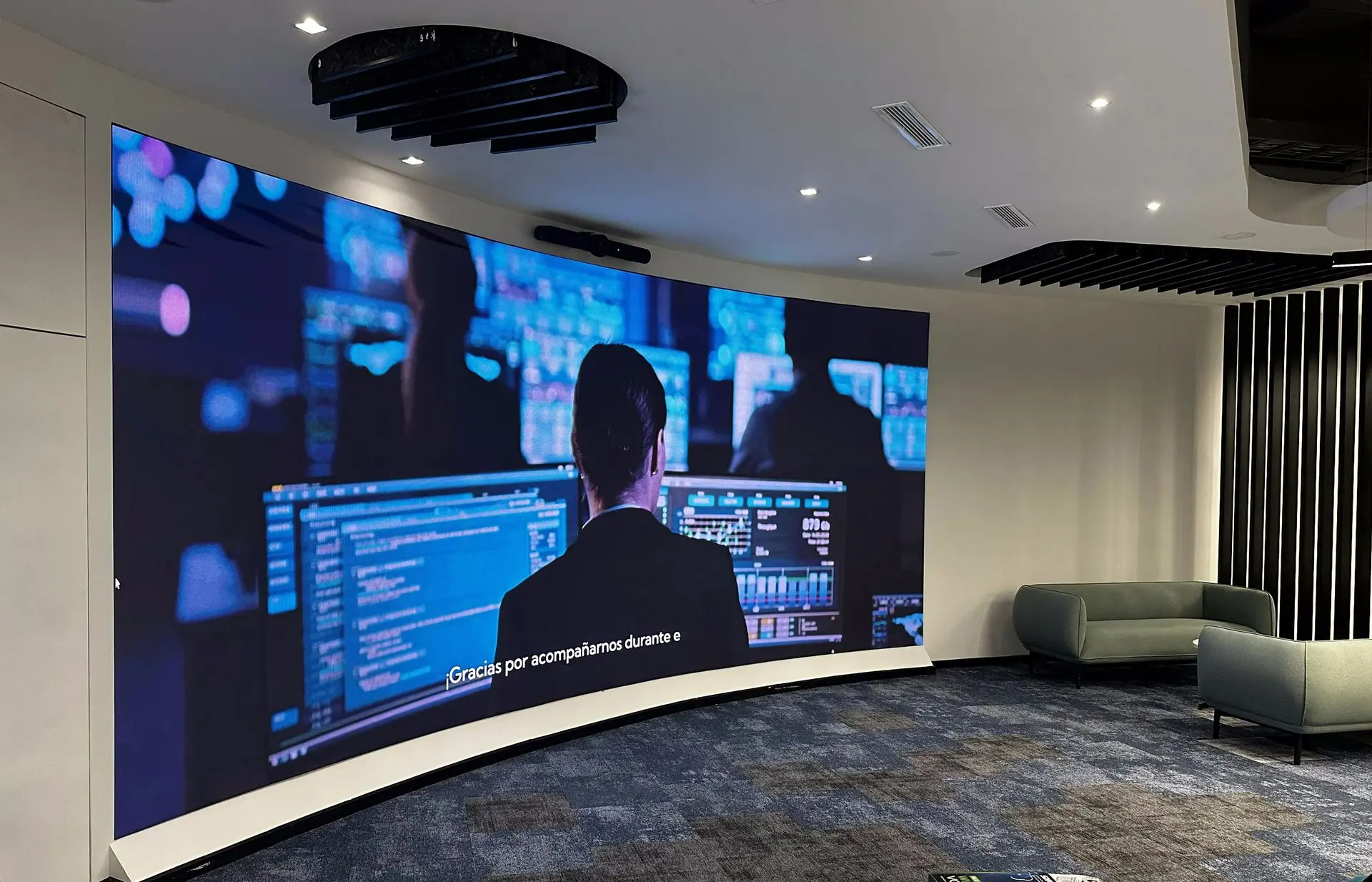 - Pantalla LED Curva: implementamos tecnología de pantalla curva de gran formato que crea experiencias visuales envolventes, ideal para presentaciones técnicas complejas y demostraciones de soluciones innovadoras.